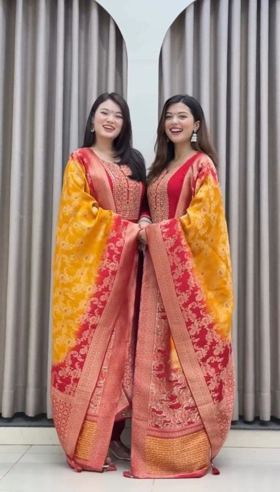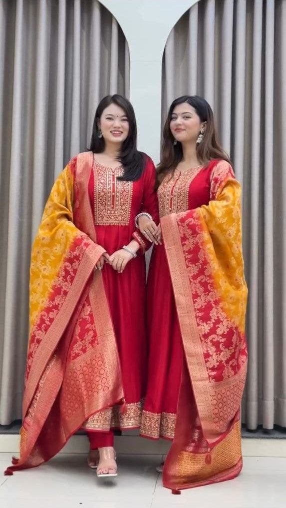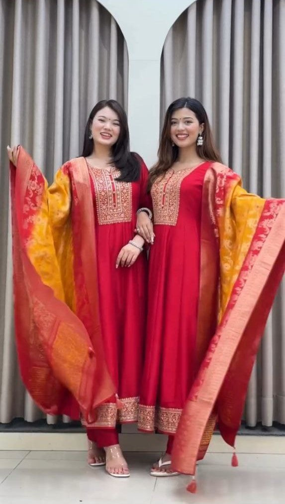 Step into timeless elegance with this exquisite Anarkali flared silk kurti set, designed to make you stand out at any festive or celebratory occasion. Crafted from luxurious silk, the Anarkali kurti features a graceful flare that flows beautifully, creating a regal and sophisticated look silhouette. The intricate detailing on the yoke adds a touch of traditional charm, while the soft silk fabric ensures all-day comfort