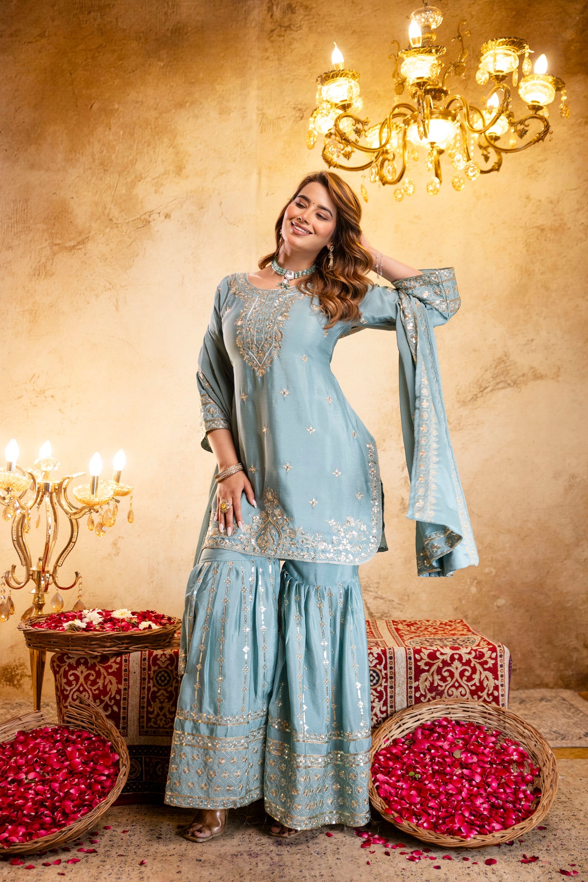 This elegant sharara set comes in a soothing pastel sage green shade, beautifully crafted from a lightweight and flowy fabric that offers both comfort and grace. The kurta features intricate embroidery with delicate thread and sequin work across the neckline, front, and hemline, adding a subtle yet rich shimmer to the overall look, while the wide sleeves enhance its stylish and airy silhouette. It is paired with a matching flared sharara adorned with detailed embroidered borders that give a festive and luxurious touch, and completed with a soft, sheer dupatta decorated with fine motifs and a heavily embellished border that drapes effortlessly. Perfect for weddings, festive occasions, and traditional gatherings, this outfit reflects a perfect blend of modern elegance and timeless ethnic charm.